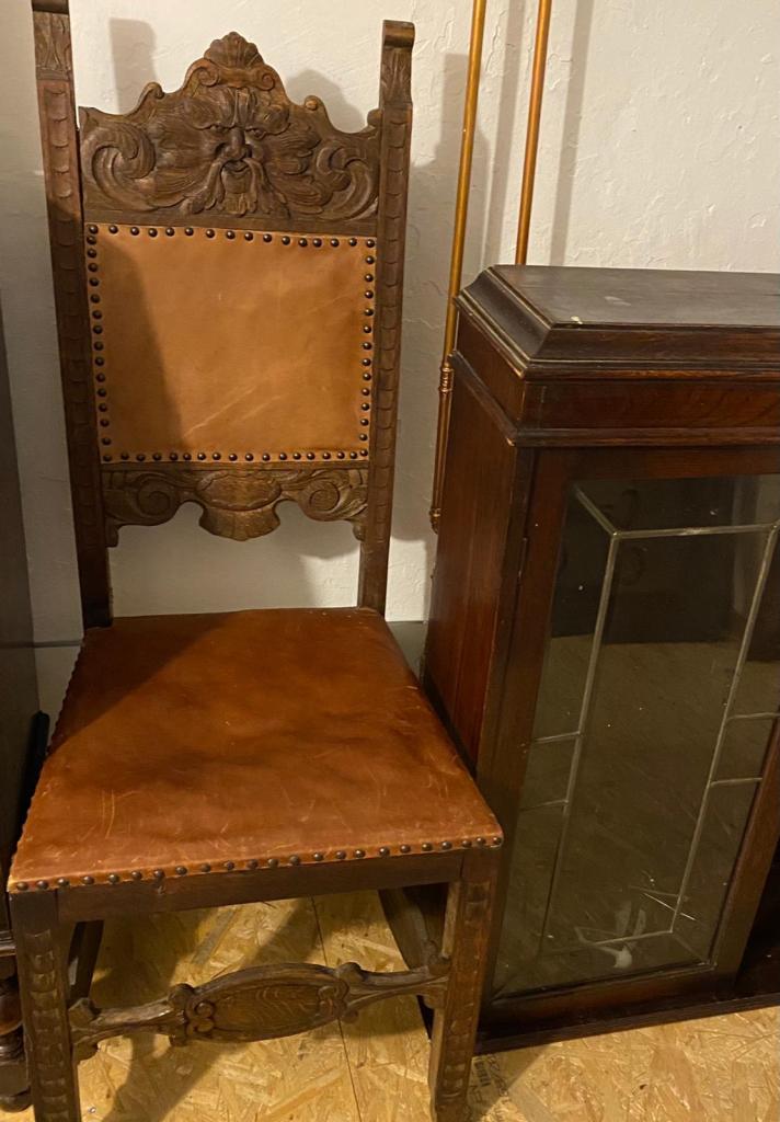 Der Gründerzeitstuhl mit Schnitzerei ist ein repräsentativer und sehr schöner Stuhl, der sich perfekt am Schreibtisch oder in anderen repräsentativen Räumlichkeiten eignet. Der Stuhl ist aus massiver Eiche gefertigt und mit braunem Leder bezogen. Die Schnitzereien auf dem Stuhl sind ein zusätzliches Detail, das den Stuhl besonders prächtig wirken lässt.