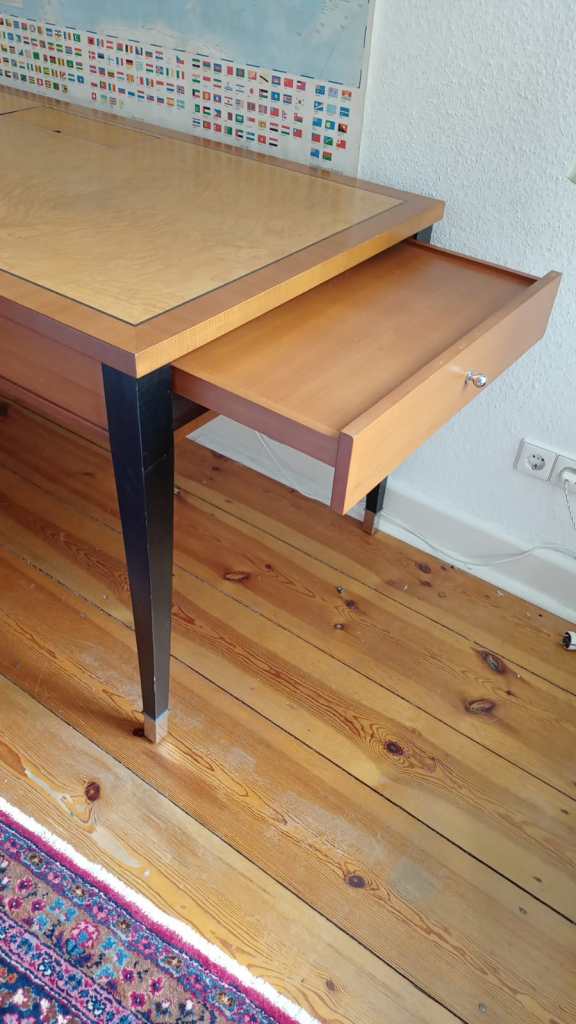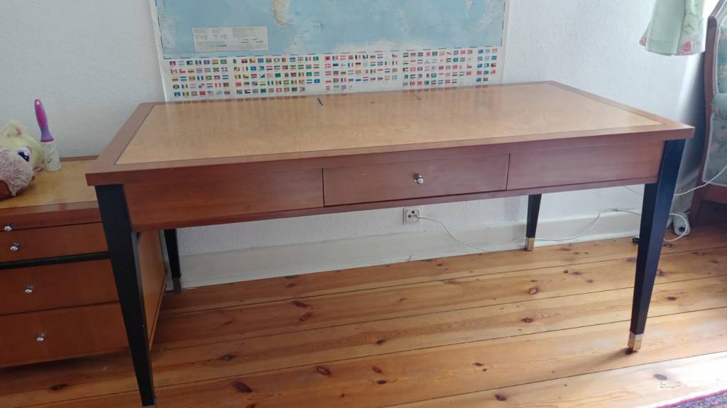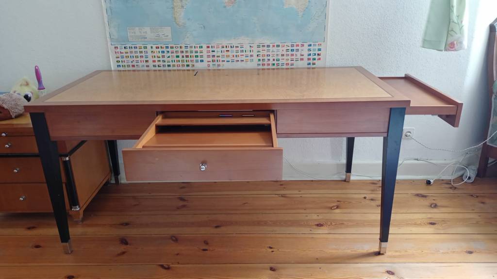 Der Schreibtisch ist sehr einfach zu bedienen und verfügt über zusätzliche Schubladen und eingebaute Steckdosen.